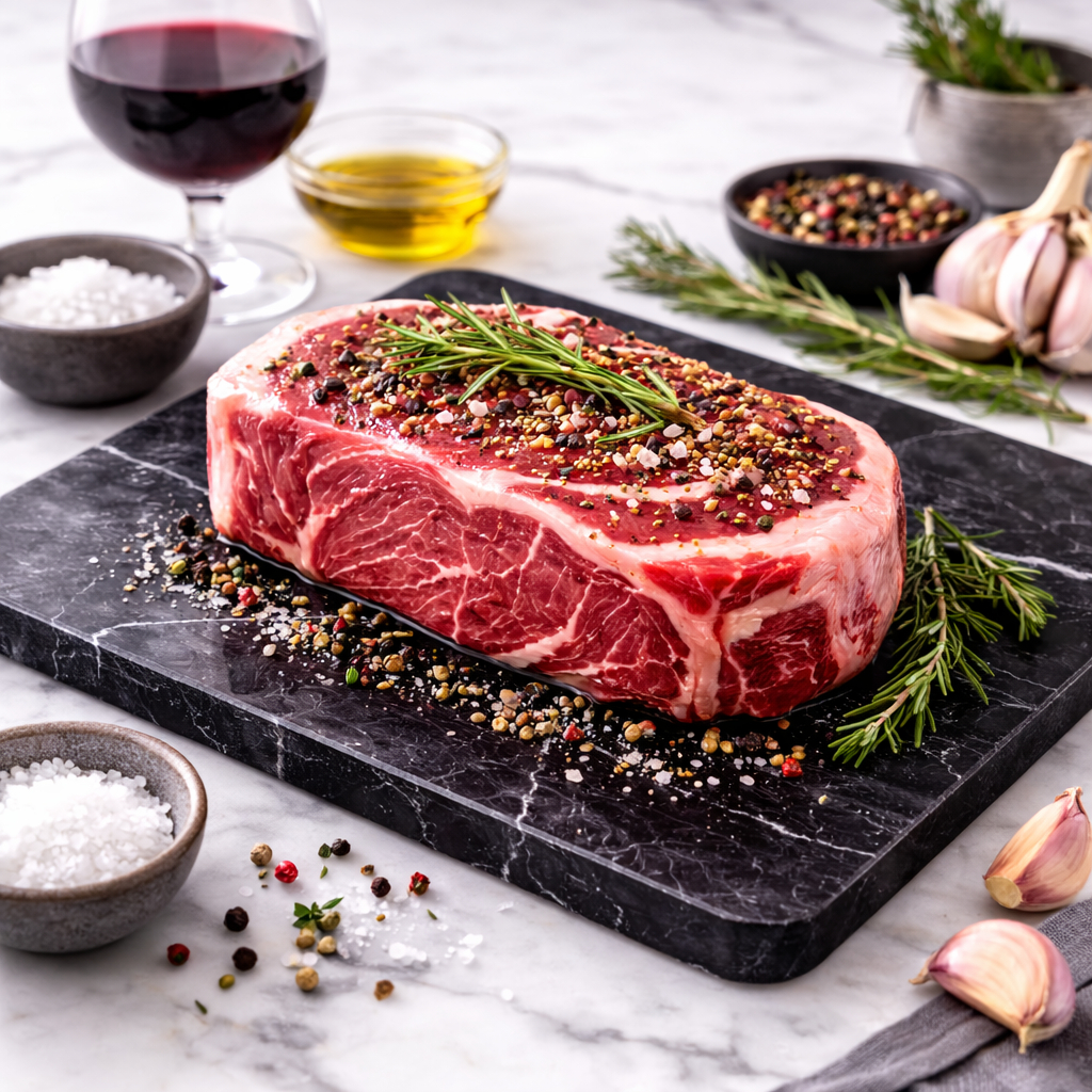 Marbled ribeye steak packed with flavour, ideal for quick cooking or grilling.
